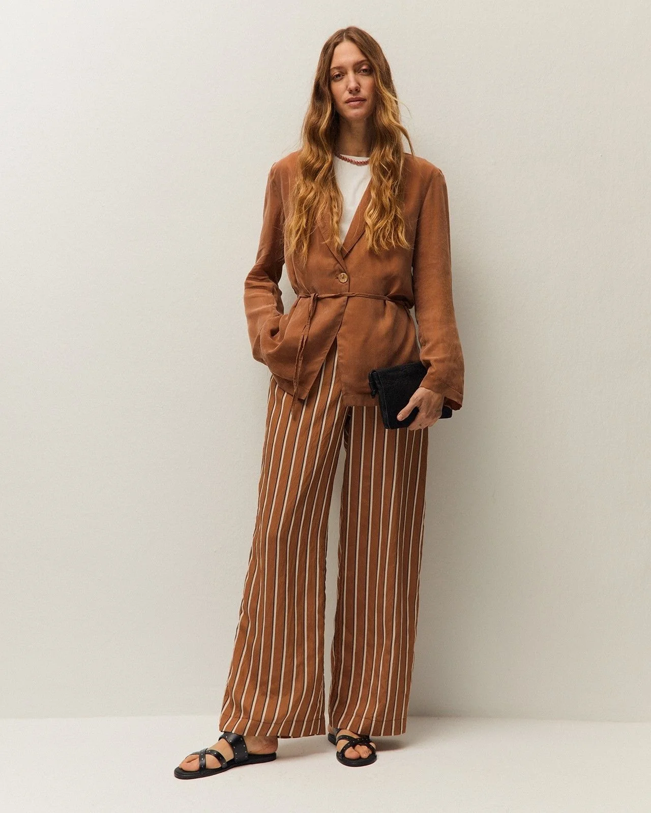 Americana fluida con cuello de solapa y manga larga, confeccionada en tejido de cupro. Detalle de cinturón del mismo tejido. Cierre con botón en el delantero.