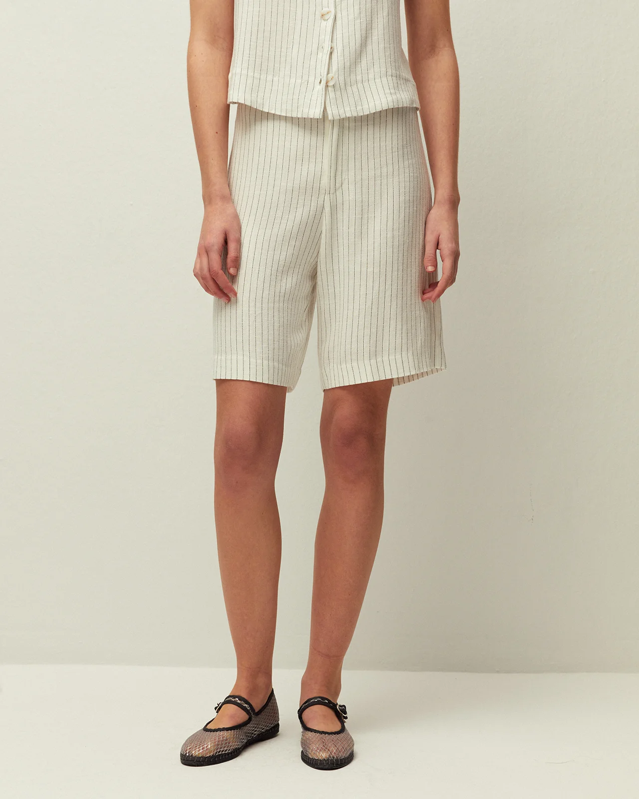 Bermuda de raya diplomática bicolor. Cierre con cremallera y botón. Prenda sostenible.