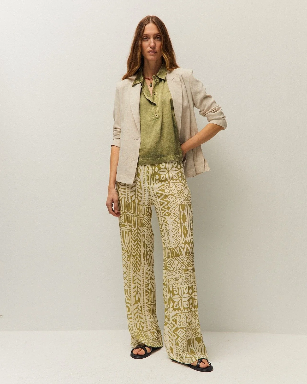 Camisa fluida con cuello polo y botones. Manga corta. Tintura corrosiva. Prenda sostenible.