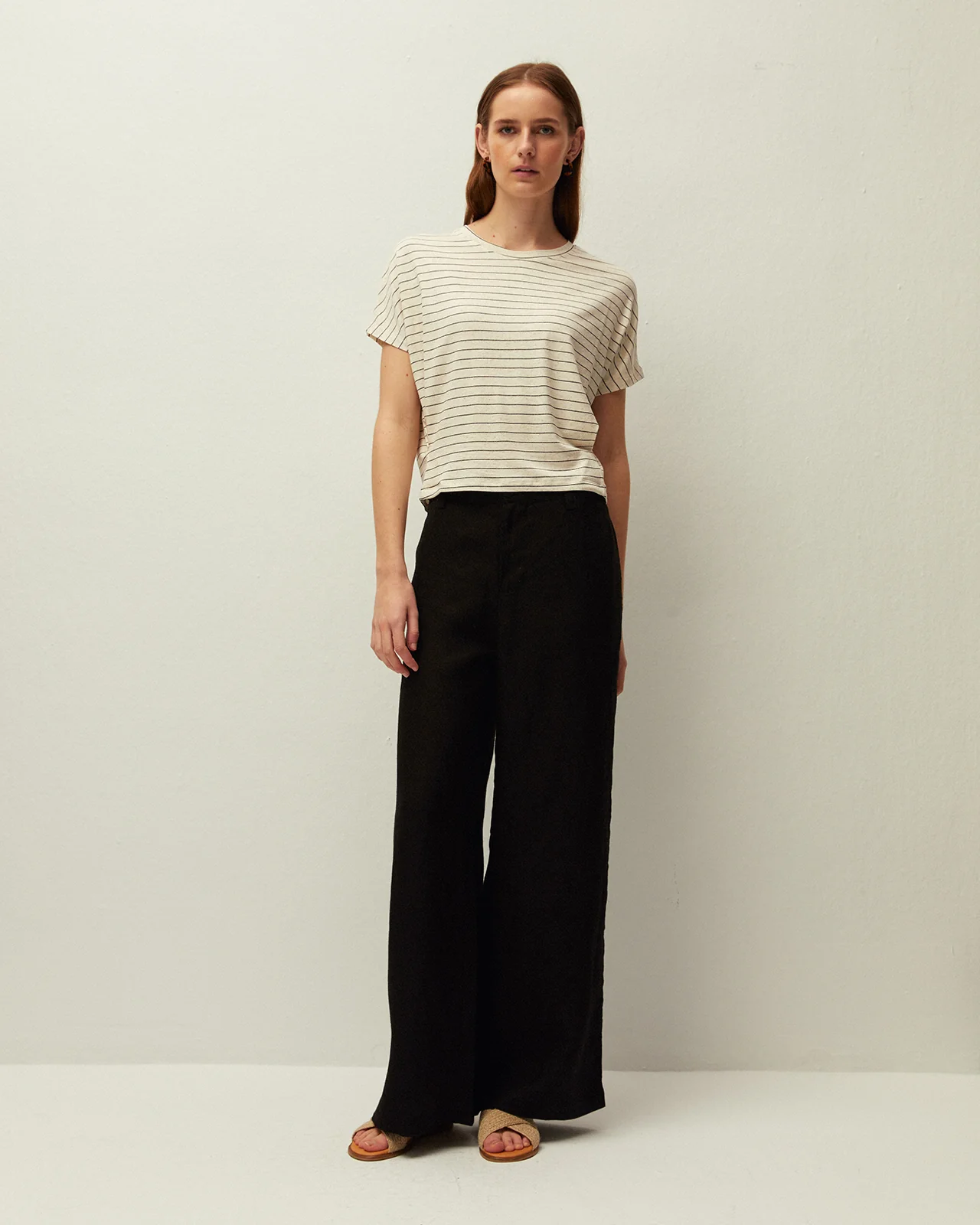 Camiseta de rayas con escote redondo y manga corta. Detalle de pliegues en el bajo. Prenda sostenible.