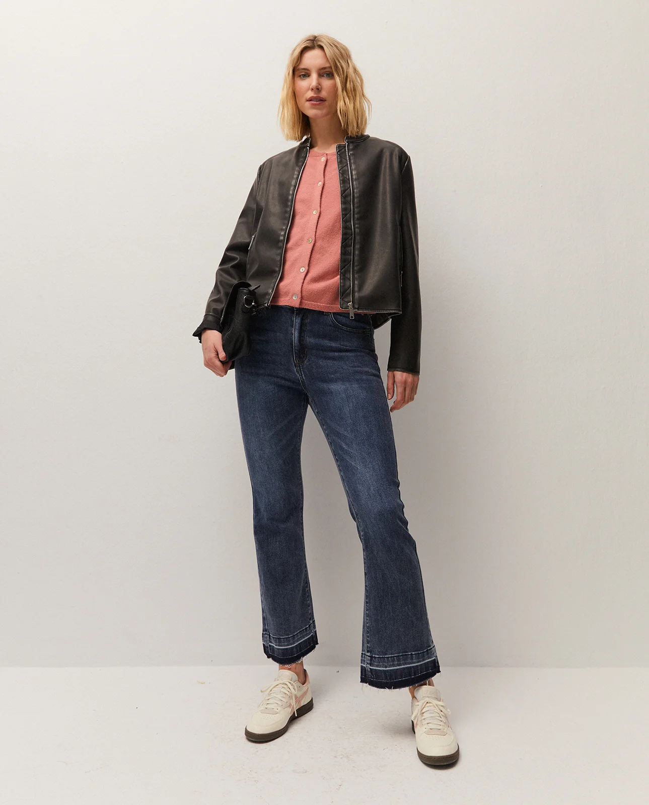 Cazadora de cuello mao y manga larga. Bolsillos delanteros con cremallera. Cierre frontal con cremallera.