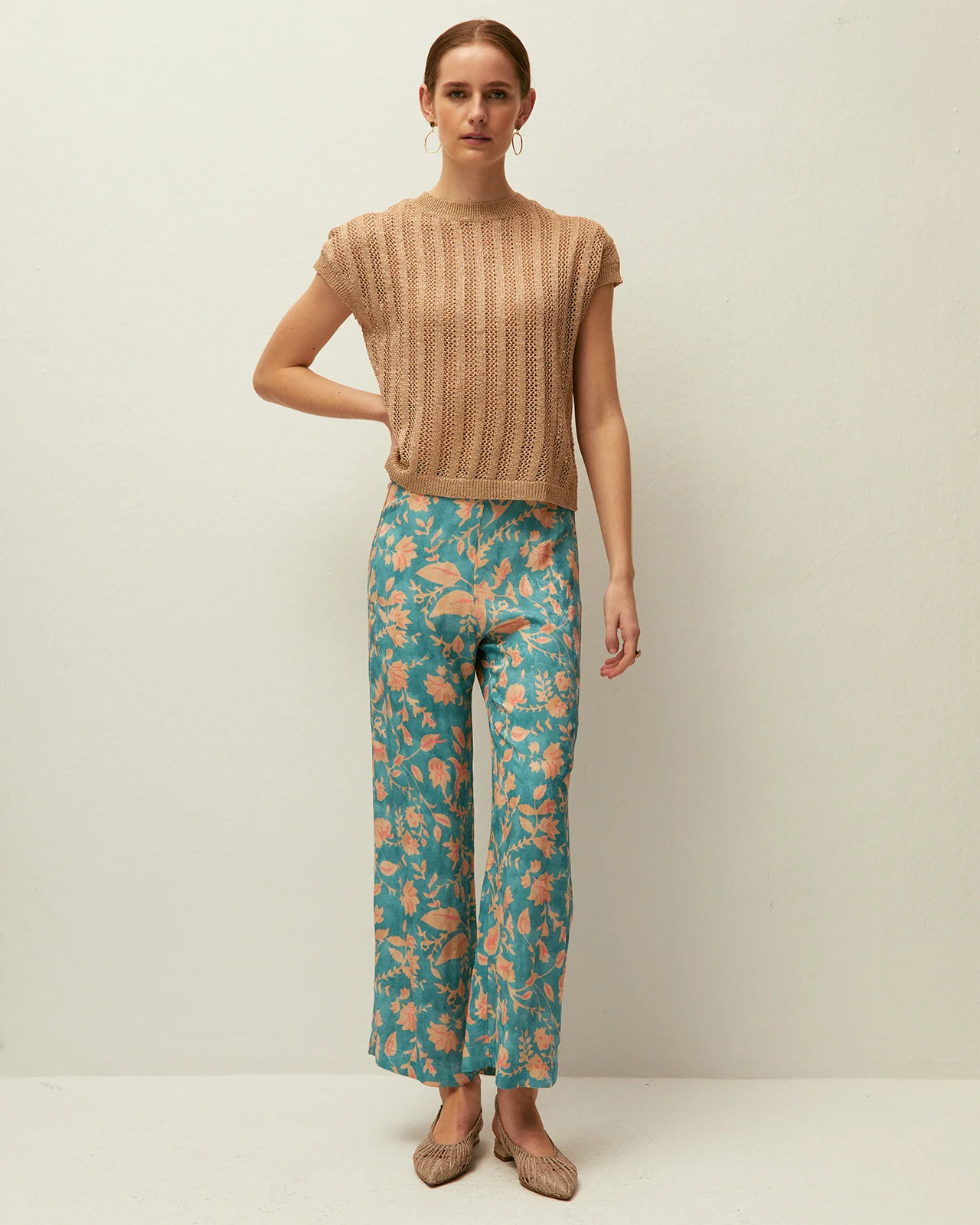 Chaleco calado con cuello redondo y manga corta, tejido de punto con lúrex. Prenda sostenible.