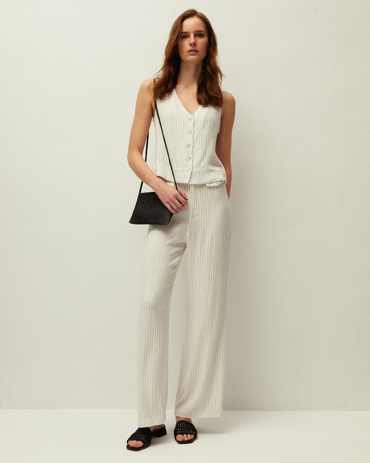 Chaleco de raya diplomática bicolor con escote pico. Detalle de bolsillos de vivo en el delantero. Cierre con botones. Prenda sostenible.