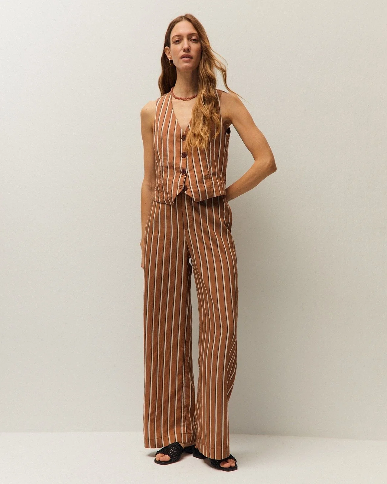 Chaleco de rayas con cuello pico. Cierre con botones en el delantero. Prenda sostenible.