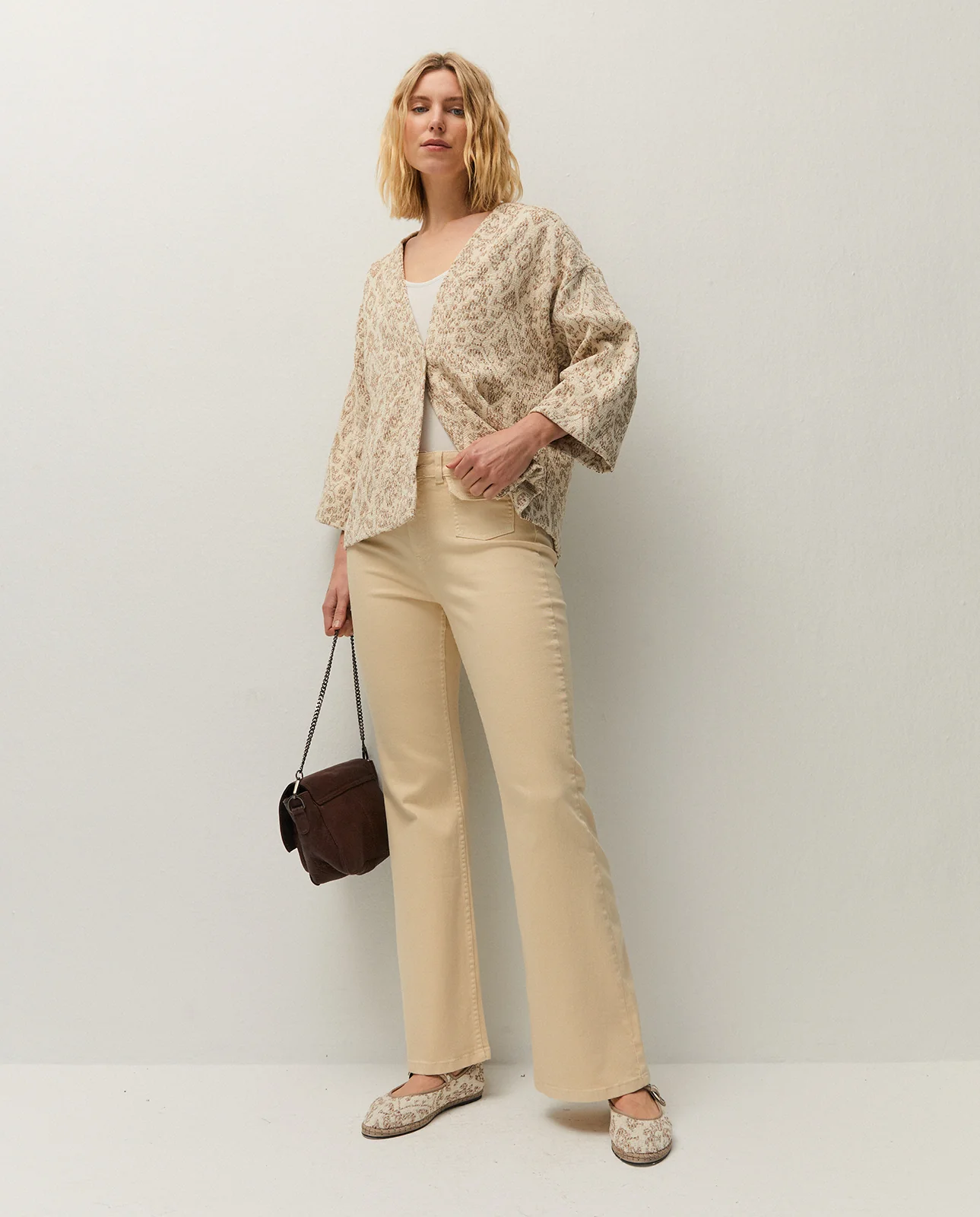 Chaqueta tipo kimono confeccionada en tejido jacquard. Cierre con botón frontal. Prenda sostenible.