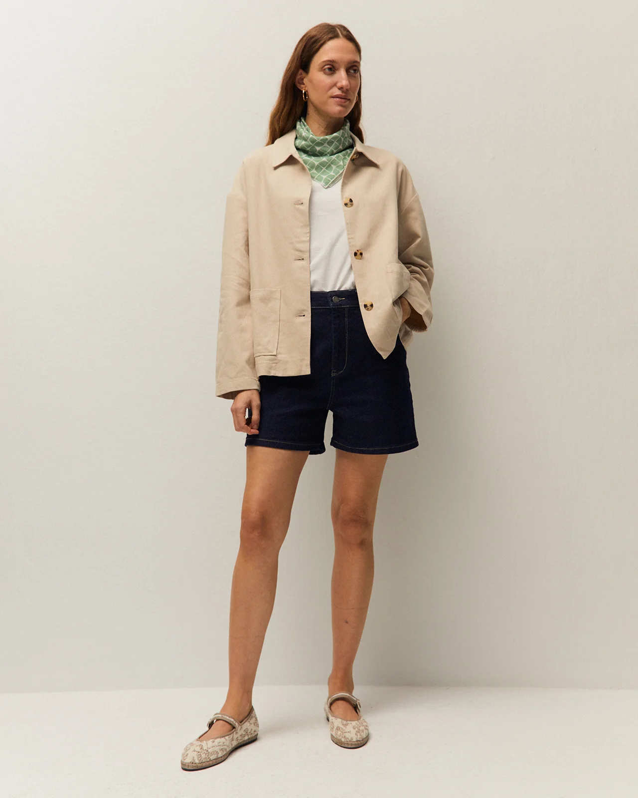 Chaqueta con cuello camisero y manga larga. Bolsillos de vivo en el delantero. Cierre con botones en el delantero. Prenda sostenible.