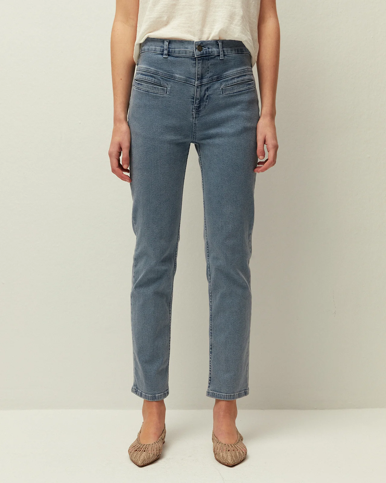 Pantalón denim recto con detalle de bolsillos de vivo en el delantero. Cierre frontal con cremallera y botón. Prenda sostenible.