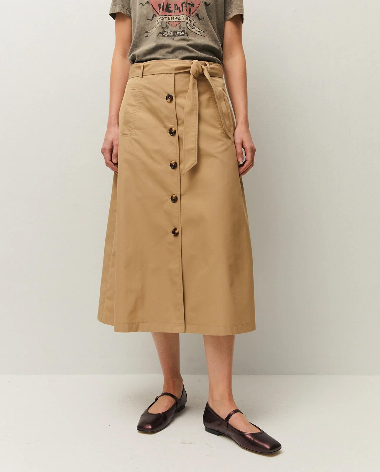 Falda midi confeccionada en tejido tipo gabardina. Bolsillos de vivo en el delantero. Cierre delantero con botón. Prenda sostenible.