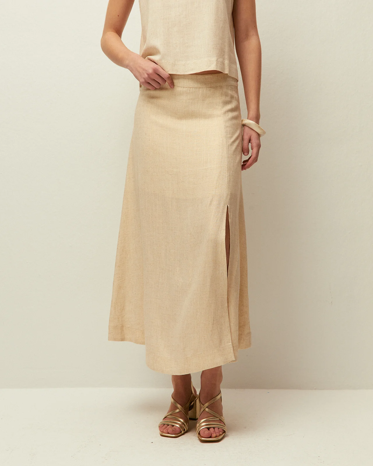 Falda evasé confeccionada en tejido de foil dorado. Cierre con cremallera lateral. Prenda sostenible.