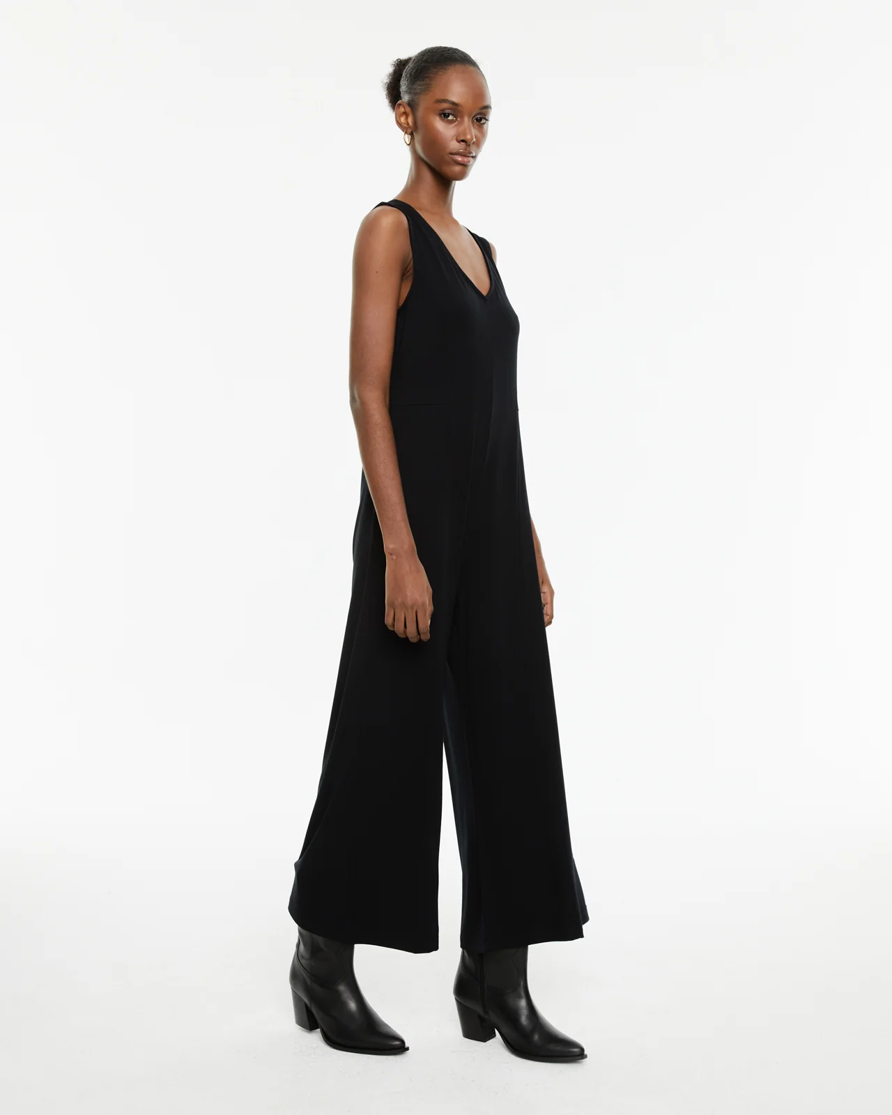 Mono de mujer largo entallado con bajo evasé, escote pico y tirantes. Prenda sostenible.