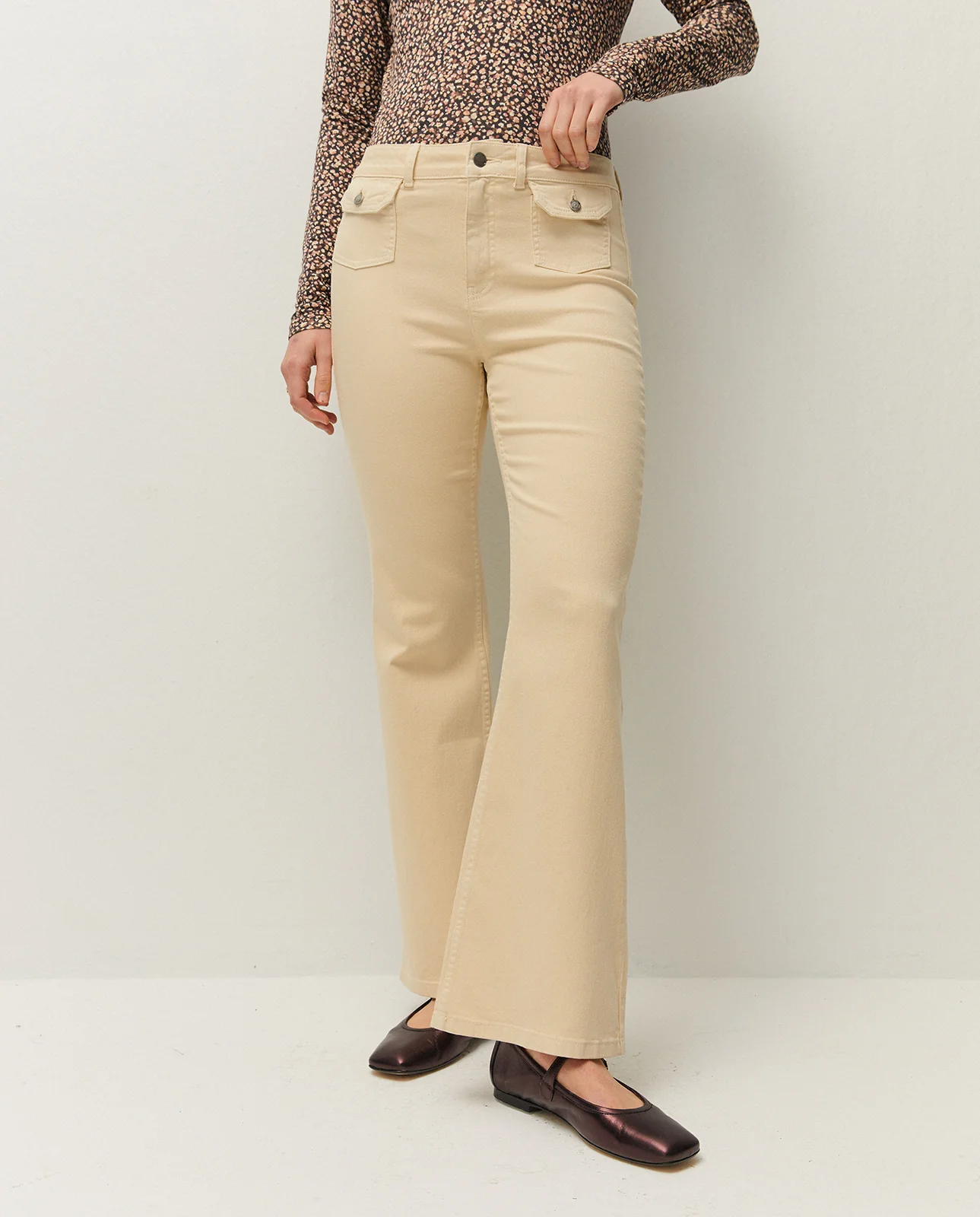 Pantalón denim de mujer de color crudo, talle acampanado. Detalle de bolsillos en el delantero. Prenda sostenible