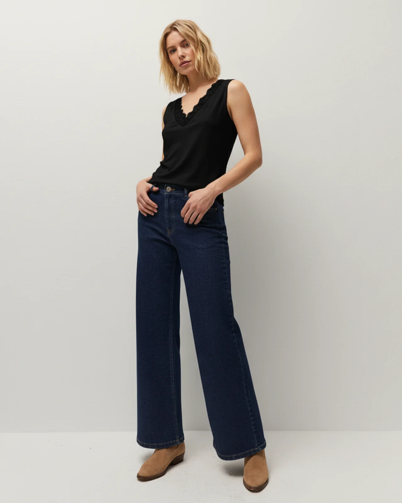 Top de mujer entallado con tirantes y detalle de puntilla. Prenda sostenible.
