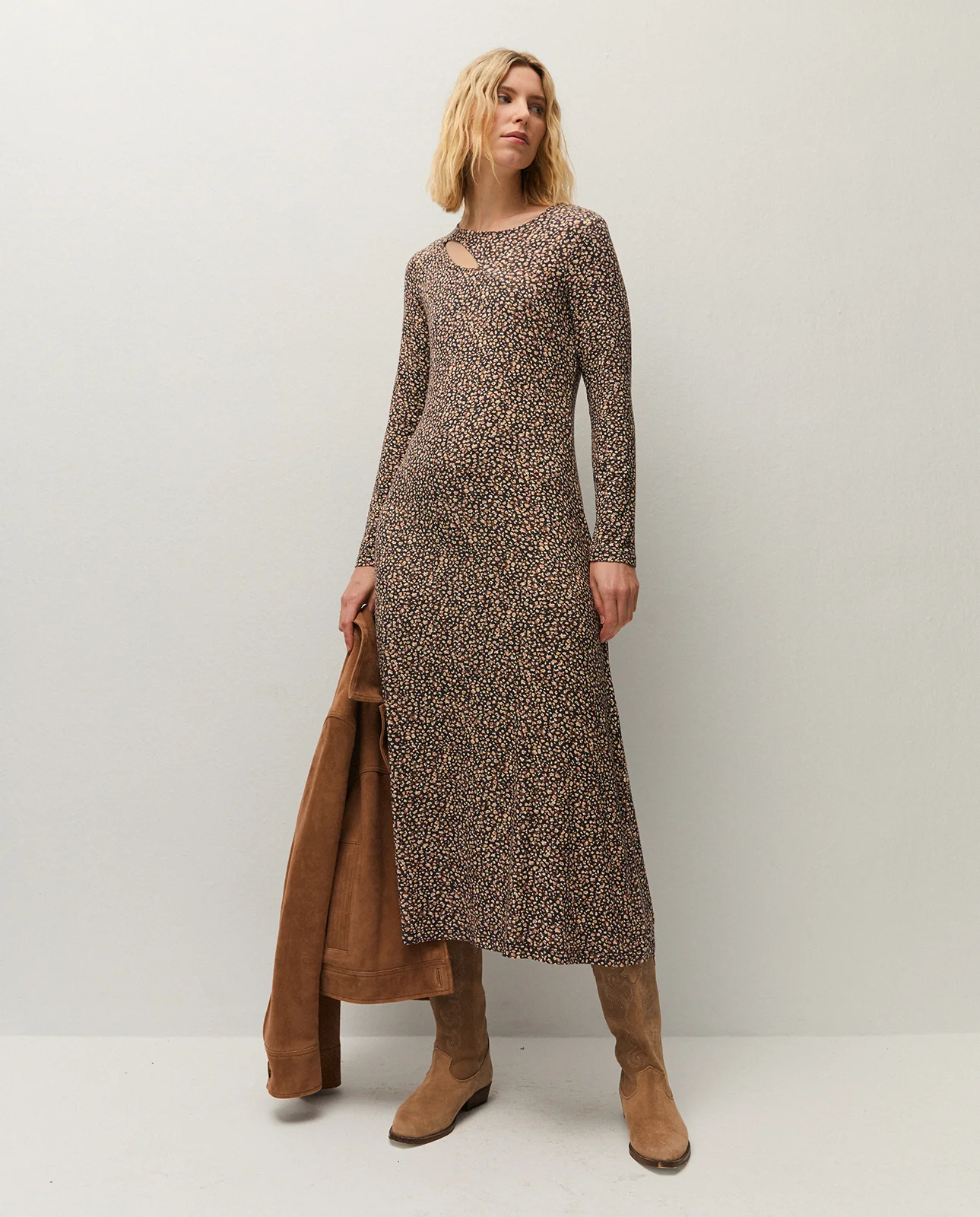 Vestido largo de manga larga y escote redondo. Detalle de cut-out en el delantero. Prenda sostenible.